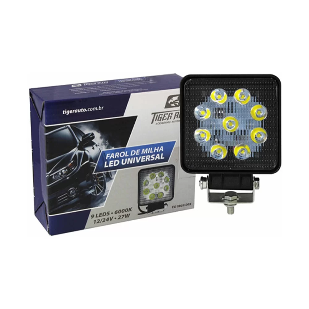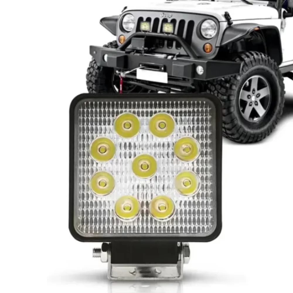 Farol de milha com 9 leds, modelo Universal, quadrado, na cor branco, off road.