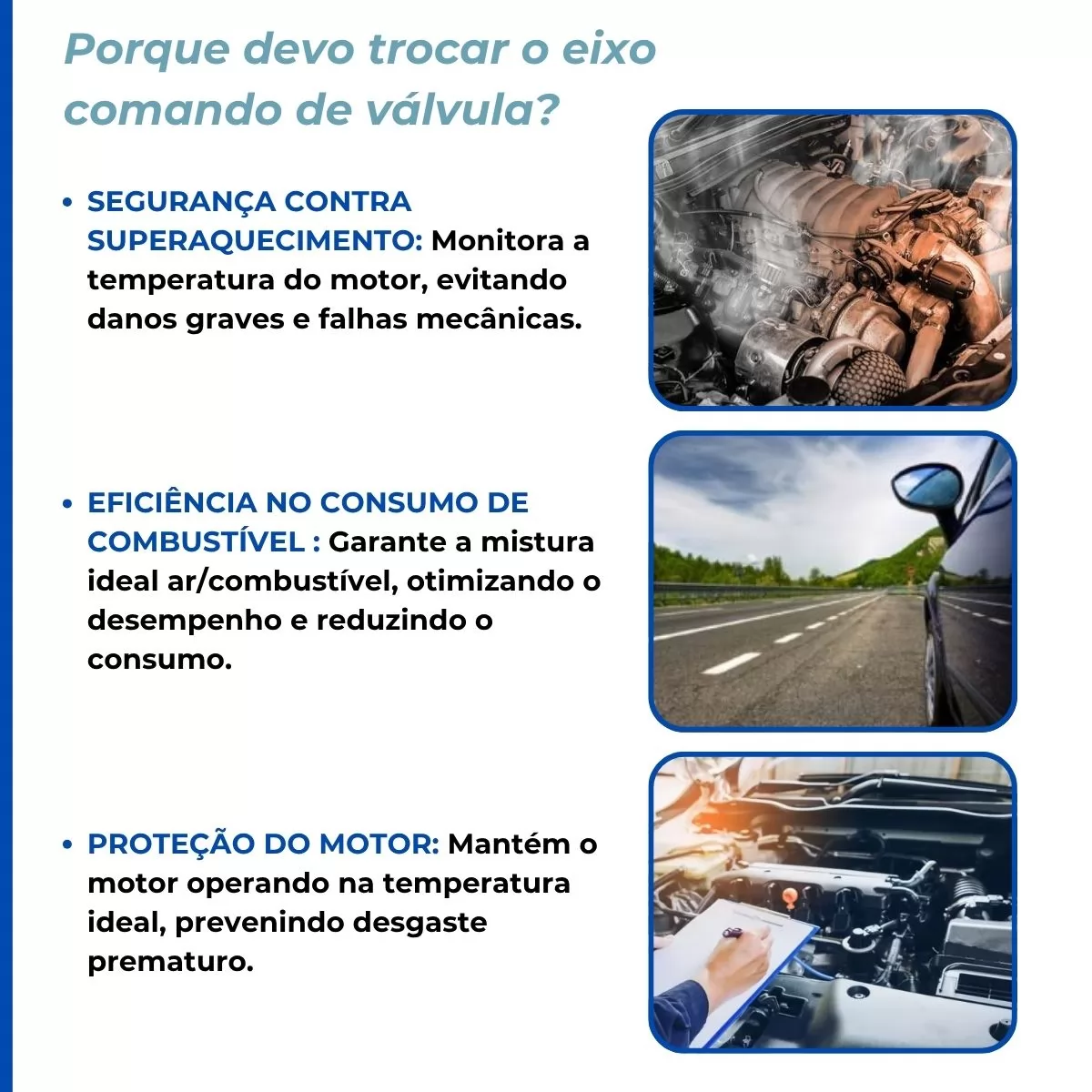 MELHORIA NO DESEMPENHO DO MOTOR: O eixo de comando regula com precisão a abertura e o fechamento das válvulas, otimizando a entrada de ar e a saída de gases, o que resulta em maior potência e eficiência do motor.
