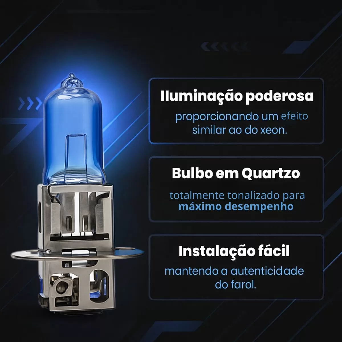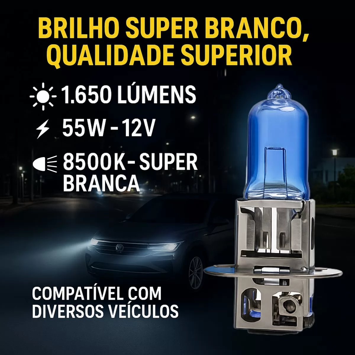 INSTALAÇÃO SIMPLES E COMPATIBILIDADE UNIVERSAL: Com encaixe H3 12V 55W, é compatível com diversos modelos de veículos, facilitando a substituição sem necessidade de adaptações.