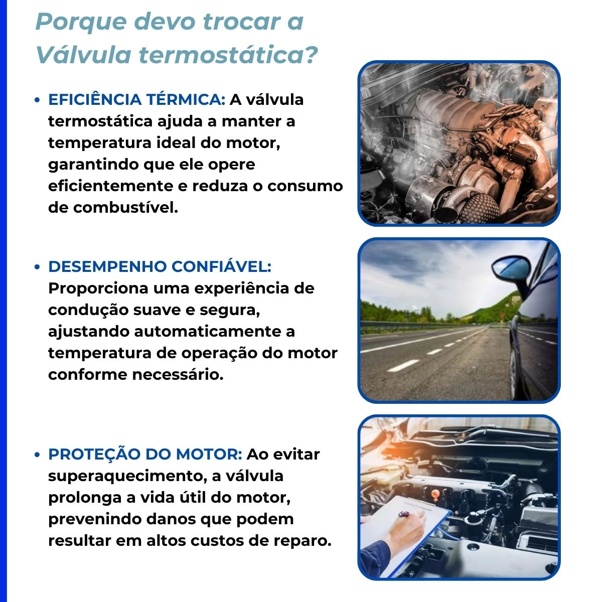 EFICIÊNCIA TÉRMICA: A válvula termostática ajuda a manter a temperatura ideal do motor, garantindo que ele opere eficientemente e reduza o consumo de combustível.